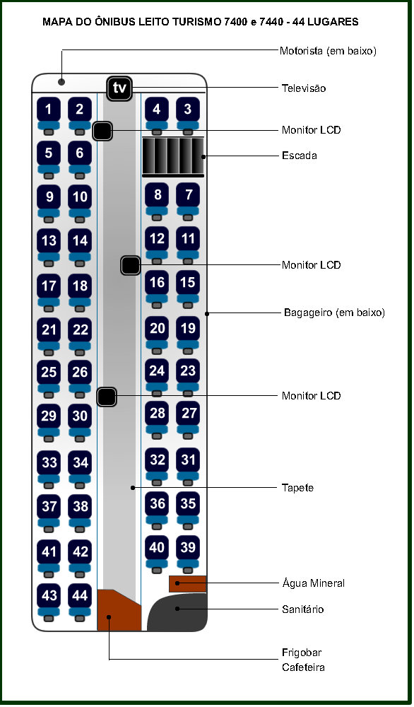 São 44 lugares, com poltronas individuais soft, com descansa-pés, aparelhos de cd, dvd, 4 telas plasmas LCD, geladeira, cafeteira, toalete, água mineral durante todo o percurso, para garantir descanso absoluto, ao embarcar e desembarcar cada cliente recebe mantas e travesseiros , tudo isso somando ao atendimento de alto nível no embarque e desembarque, característico no padrão de qualidade da Expresso.
