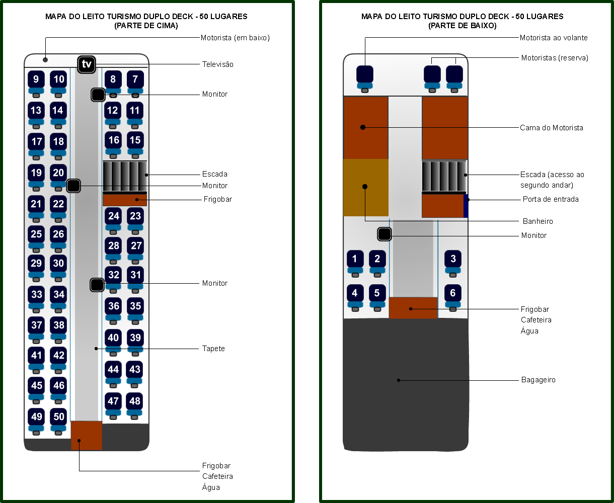 São 50 lugares, com poltronas individuais soft, com descansa pés, aparelho de CD, DVD, MP3, 5 monitores, calefação, ar- condicionado, independente 1º andar e 2º andar , cafeteira, Frigoobar , duas geladeiras , sanitário, carregador de celular, água mineral durante todo o percurso para garantir descanso absoluto ao embarcar e desembarcar cada cliente recebe mantas e travesseiros, tudo isso somando ao atendimento de alto nível no embarque e desembarque, característico no padrão de qualidade da Expresso.